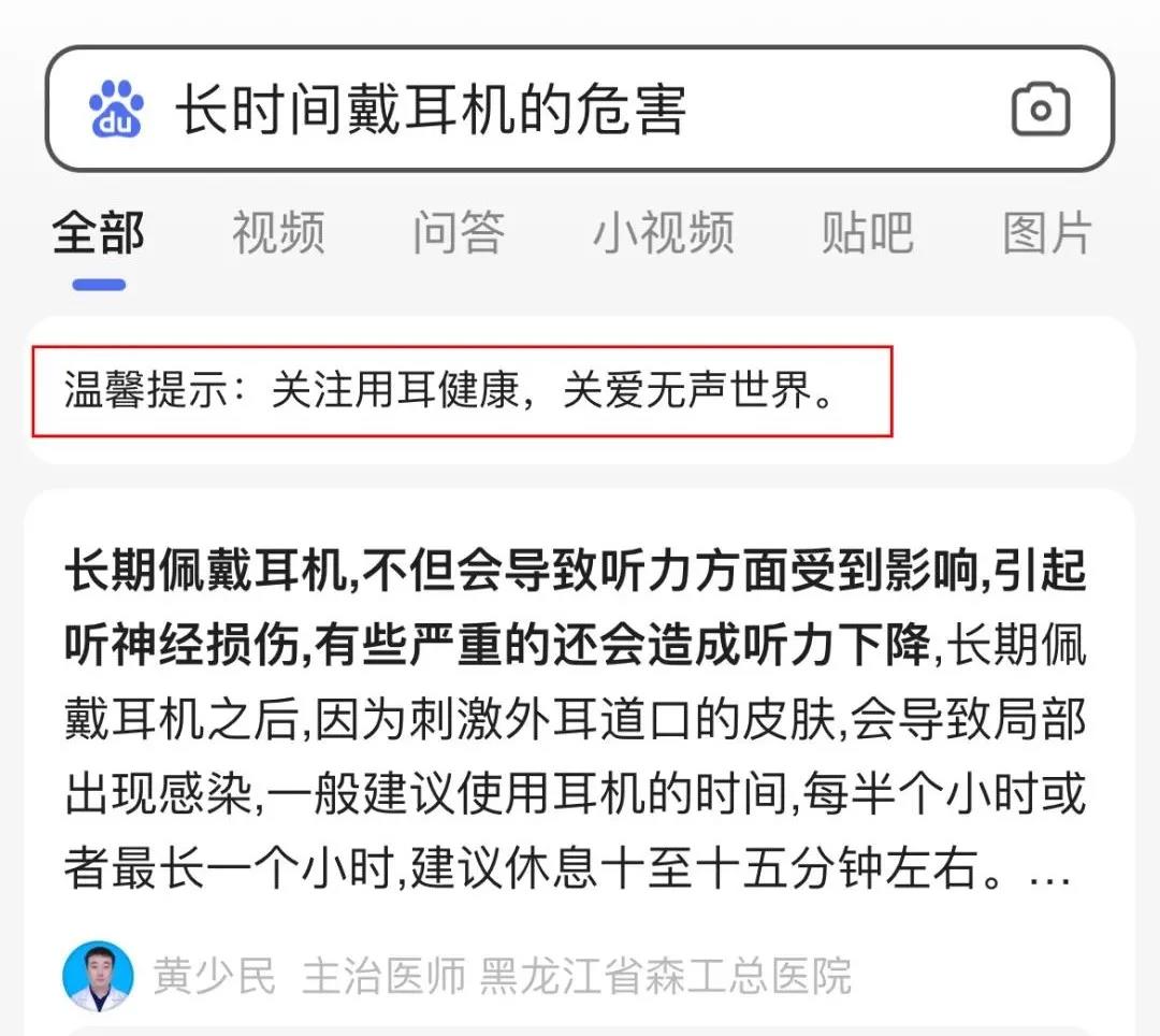 就像这次的国际聋人日,当你去百度APP搜索「长时间戴耳机的危险」的时候,结果页就会出现这样的温馨提示。