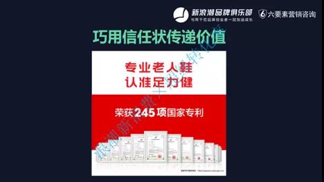 我做一款老人鞋,有200多项国家专利,你是不是立马就觉得这个品牌不一样了。所以这个时候,你就用国家专利这个信任状,传递产品真正的价值。