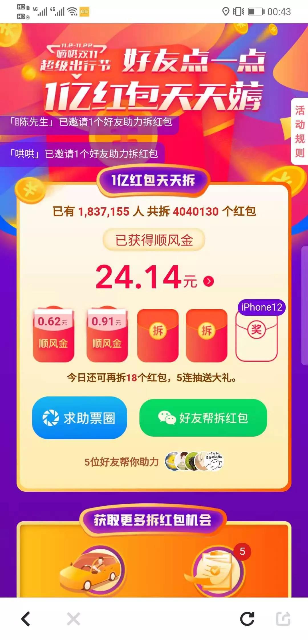 用户从各种方式进入活动,好友助力拆红包获得顺风金,拆满5个红包获得抽大奖资格,并且拆满25个红包5连抽必得额外大奖,每天11点11分开奖,得到反馈。