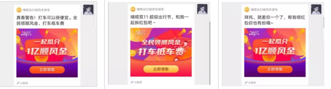 小程序的分享文案设计多种多样(不排除是在内测传播效果),而唯一不变的是"一起瓜分1亿顺风金",看起来更偏向于"利他"的文案,容易引导用户的点击;