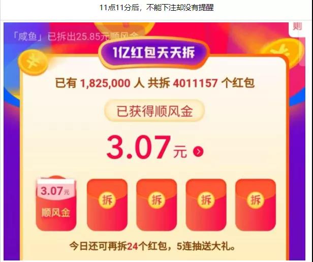 ④"顺风金"相关的设计,可以看到有多少用户参与活动,拆了多少红包,营造活动的气氛及真实性;