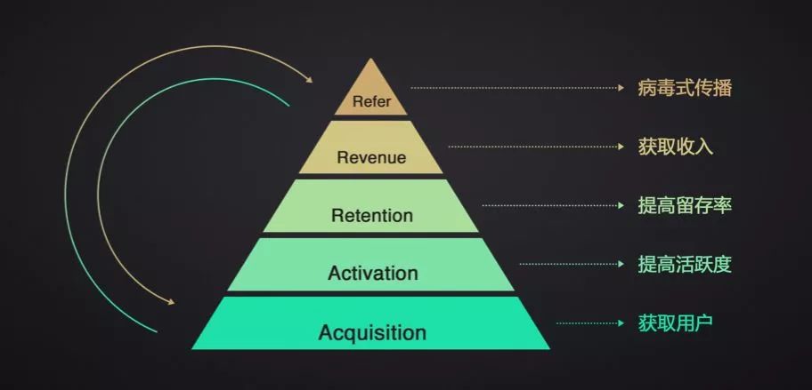 AARRR模型具体分为获取(acquisition)、激活(activation)、留存(retention)、收入(revenue)、传播(refer)