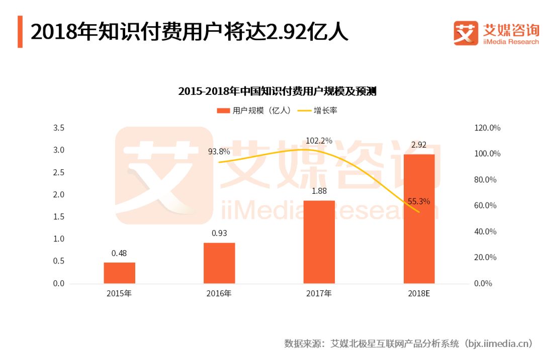 iiMedia Research(艾媒咨询)数据显示,中国知识付费用户规模呈高速增长态势,2018年知识付费用户规模预计将达2.92亿人。艾媒咨询分析师认为,随着移动支付技术的发展和整个社会对知识的迫切需求,知识付费市场不断扩大,用户逐渐养成知识付费的消费习惯。随着2018年上半年知识付费市场传播以及营销手段的不断演进,知识付费市场发展空间仍受人瞩目。