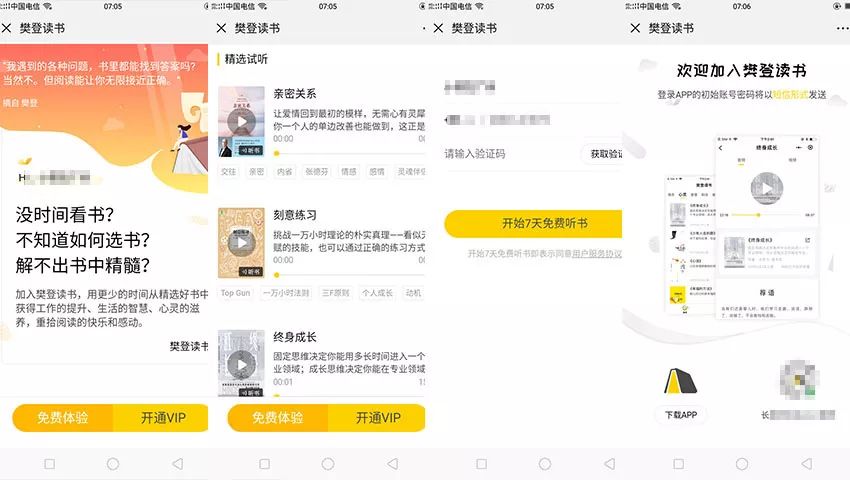 <邀请好友免费体验7天>让用户免费体验7天,可以试听vip所有包含的视音频,而试听的方式有两种,app和小程序都能实现,降低用户的心理负担,提高用户的体验。