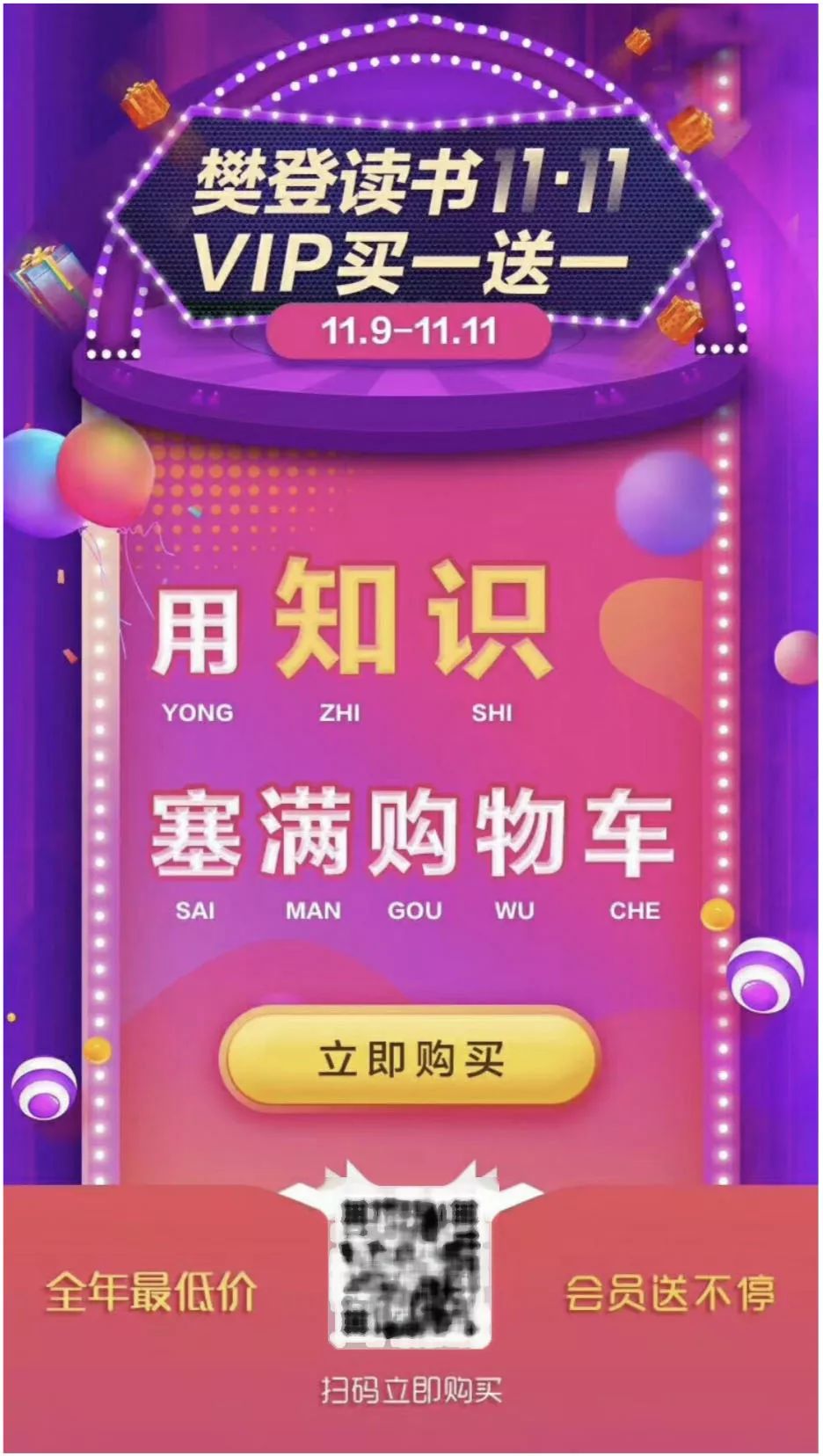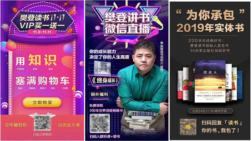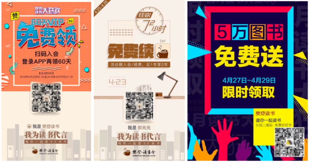 各种线上的营销活动,有结合热点、免费赠书、社群直播、vip买一赠一等等,快速促成用户拉新作用。