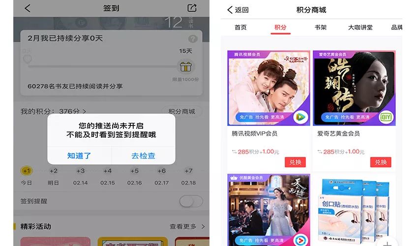 通过签到引导用户每天登陆app,签到得到的积分可以兑换商品,兑换商品除了书本、还有周边及相关的产品,把积分的价值做得比较好,尤其是从最初的时候,商城的书本只能用积分来进行兑换,可能现在的用户群体比较多,满足了书本可以积分+金钱的方式。