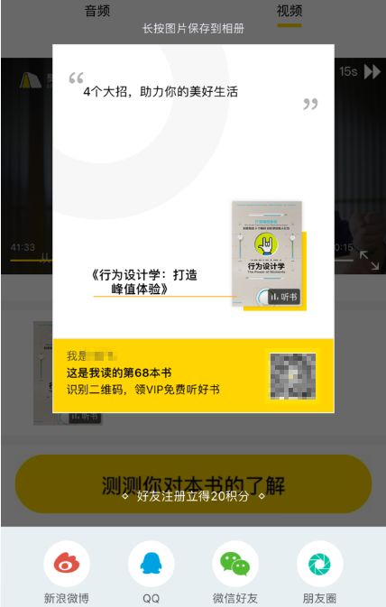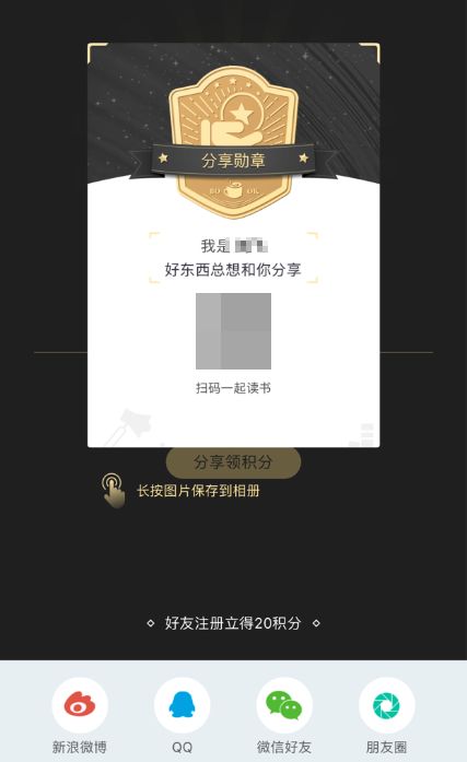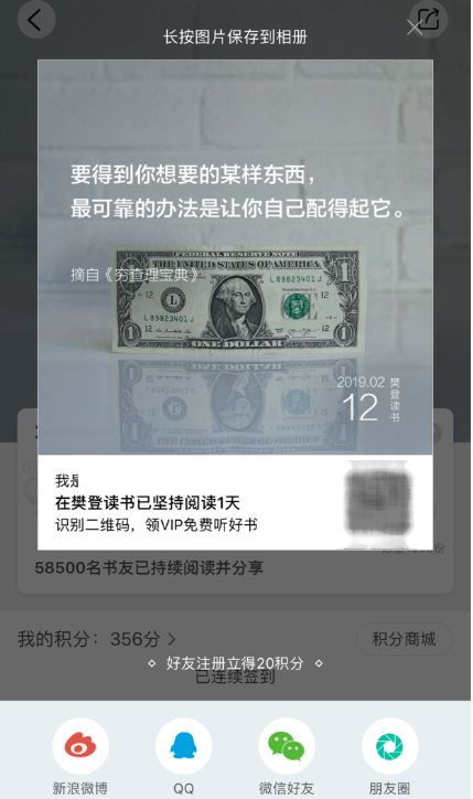 <图2>引导用户签到之后,弹出分享海报,赠送好友免费vip,因为积分在樊登读书会的价值比较大,能购买纸质书本和周边产品。