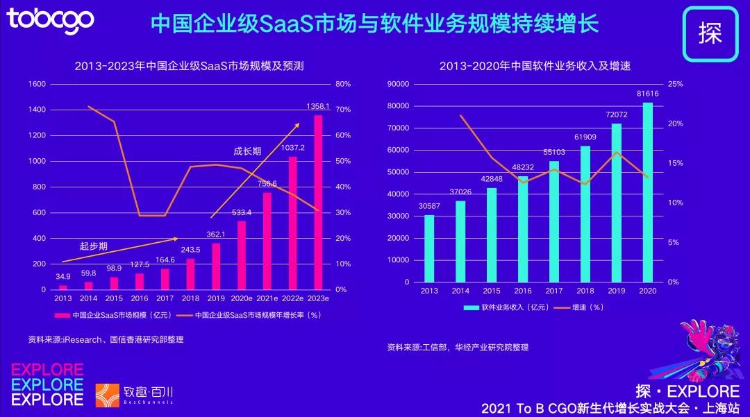 首先,我们来看几张有意思的数据。大家看一下中国的企业级SaaS和软件行业在过去的几年,以及未来的好几年依然将保持非常高速的增长。