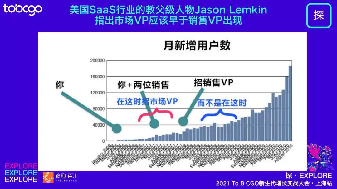 这个事情归市场VP核心负责,当你(CEO)把这个事情跑通后,你再去加销售,整个公司能够完成更加平顺的增长。这周给我们客户讲这个道理的时候,他说这个图好,我怎么能够让我的CEO不经意间的看到这张图片。这是一个比较重要的命题,当我们选中了谁来当进攻系统的前锋时候。