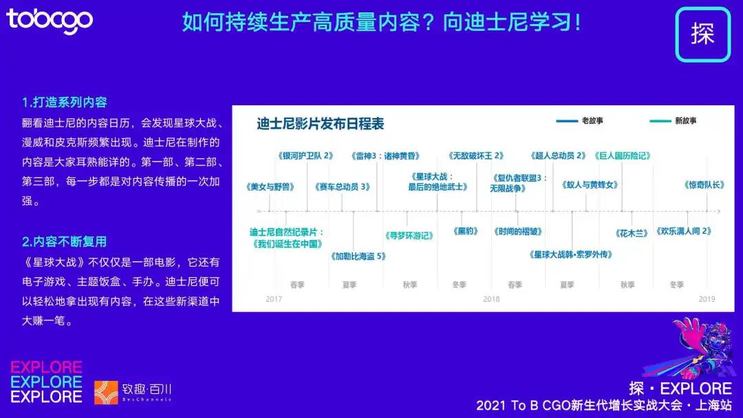 迪士尼做内容营销的典型方法,你可以看得出来。比如各种总动员,是不是12345一直在发布。我们给到客户的建议,各位在生产好的内容的过程当中,要学会一个单词叫做累积性优势,我们称为叫做accumulated advantages。
