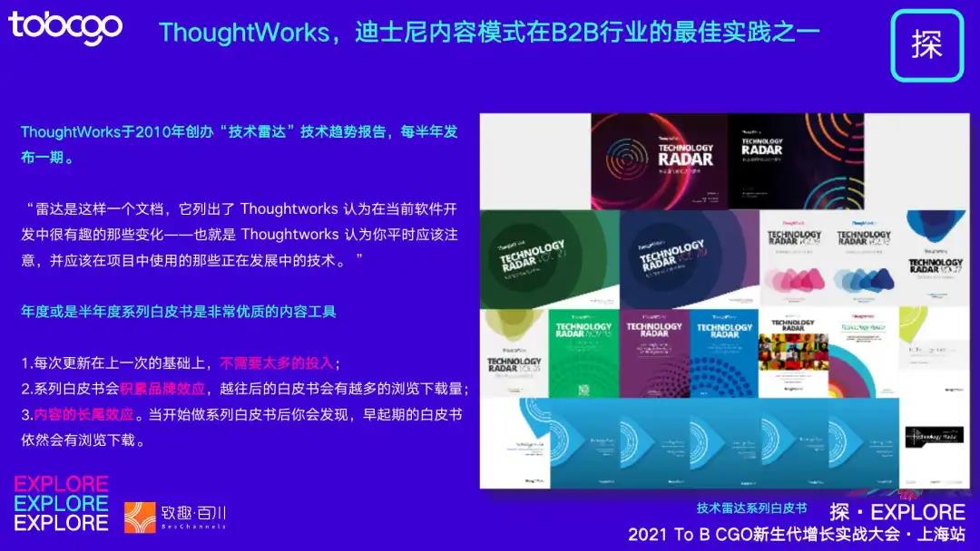 这个内容在数据上怎么体现出来呢?我们给大家举一个例子,这个客户叫Thoughtworks,它是一家非常有名的IT咨询及交付公司,他们把迪士尼这种方法运用到To B的内容上里面了,他每年都会生产半年,都会生产一个叫做技术雷达。