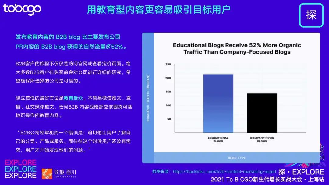 回顾到内容上面来,我们刚刚讲过,针对To B做内容,我建议大家多做这种educational content,什么叫educational content,翻译过来非常简单,你作为用户,你看了会非常有收获,你觉得学到东西了,我们就叫它educational content,它是一个非常强的返璞归真的过程。