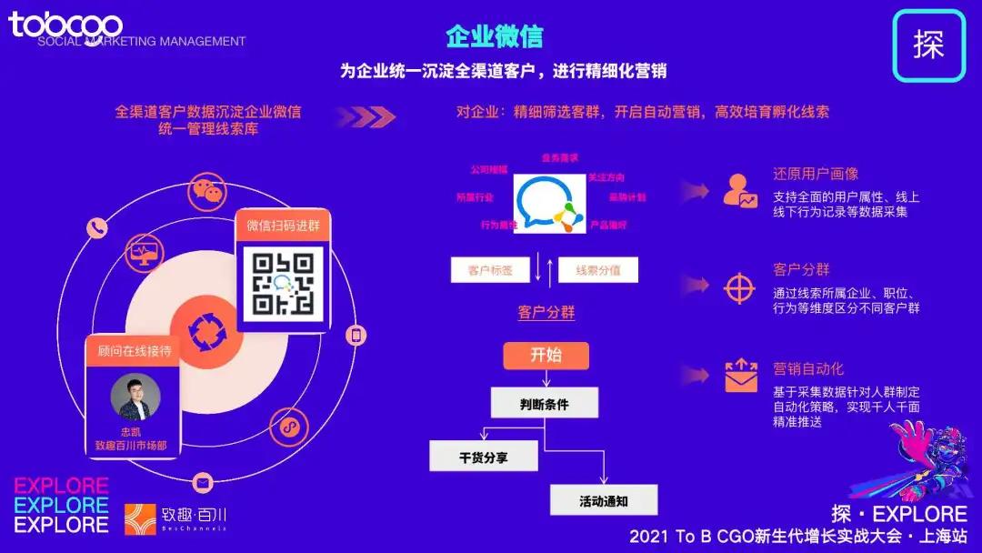 当我们在展会上获取到流量之后,有的客户会在展会上通过企业微信去留住一部分的流量,接下来就要考虑数据怎么能够同步到企业微信,比如说什么来源、什么标签,看过什么内容。需要在企业微信上进行相关的同步,企业微信后面的SDR,以及包括营销自动化,才知道下一步应该做什么。