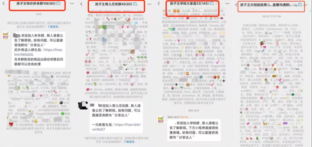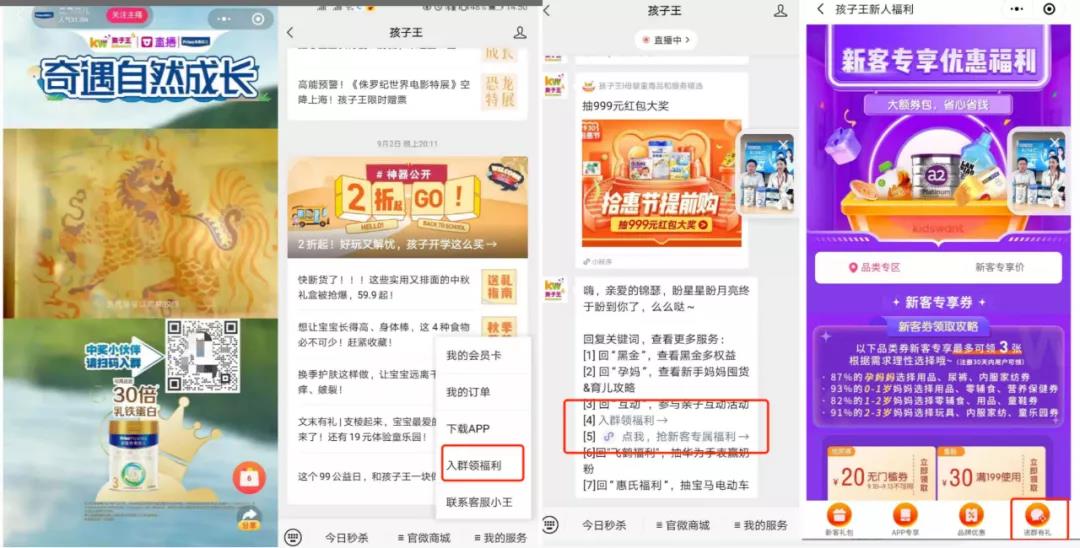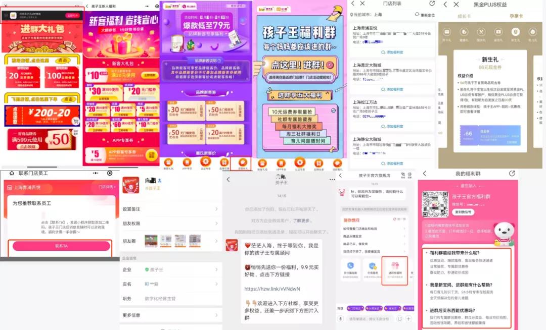 大家看如图的入群链路,会发现孩子王会通过小程序、视频号、公众号、APP 、客服区都会进行入群引导。