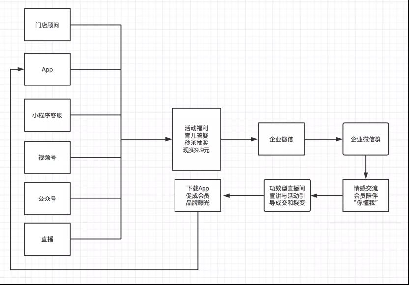 孩子王公域平台相对于一些新消费品牌做的不是特别出彩,但孩子王私域起盘其实挺不错的,从最开始主推孩子王App和会员到引流到企业微信,每一步都很扎实,比如孩子王的私域链路还算清晰:主要从公众号/App/门店顾问/视频号/门店/小程序/直播间/朋友圈引流到企业微信个人号再引流到社群最后引导入App中进行分销并参与活动。