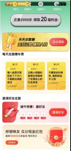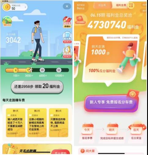 紧扣"出行"属性,用户每天除了坐车就是步行,利用用户步行的行为产生效益,再辅之以喝水、睡觉两项每日必须的行为,产生福利金,促进用户转化。