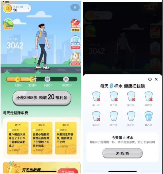 走路获取收益的玩法,再各大平台已经屡见不鲜(保险、公益、微信步数等),所以对用户而言没有教育成本,再加上定时喝水、限时睡觉的任务,提高用户访问app的频率,提升用户在平台的粘性。