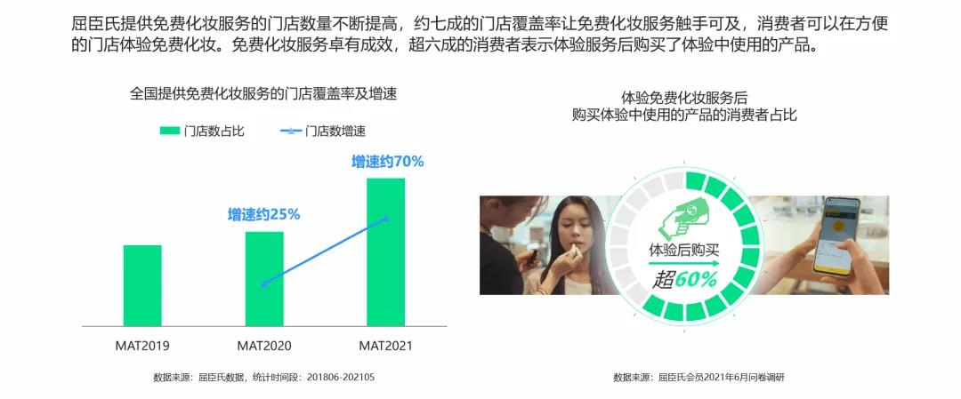 屈臣氏提供免费化妆服务的门店数量不断提升,7成的门店覆盖率让化妆服务触手可及。其中,有超6成的消费者表示体验服务后购买了体验中使用的产品。