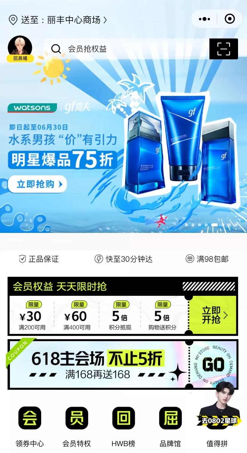 假若你是一位目标年轻男士,打开屈臣氏小程序会看到开屏霸屏的高夫恒润广告,进入种草社会看到引导试用,多个线上触点覆盖"你的世界"。