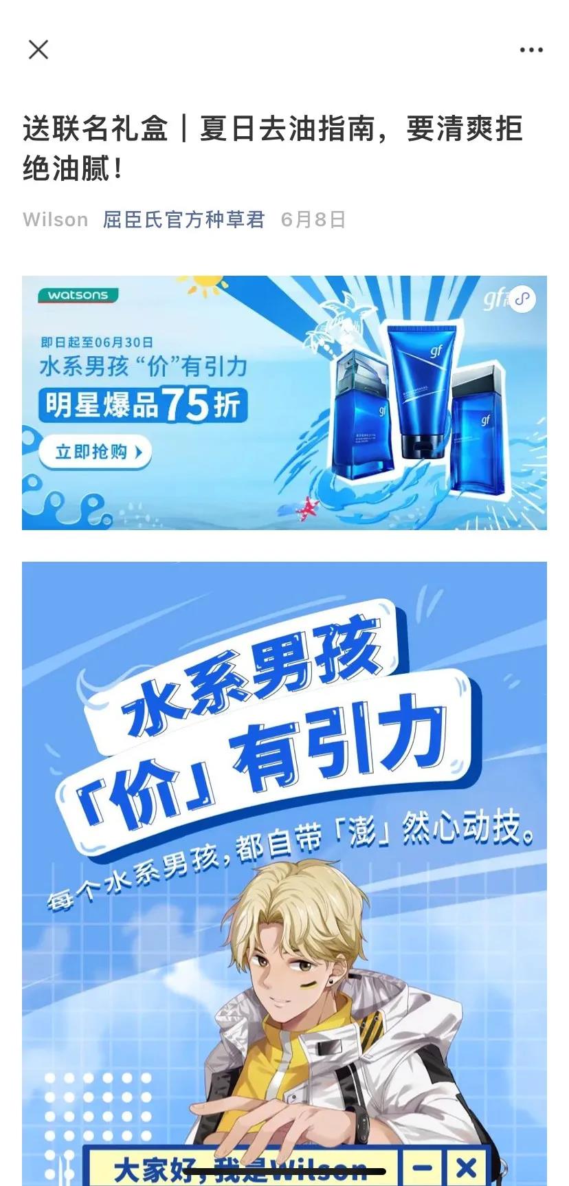 你打开关注的优质KOC列表,发现他们在为高夫恒润系列推广种草,口碑发酵;想在微信订阅号、微博等平台搜索高夫恒润,也能看到屈臣氏为其新品做推荐。