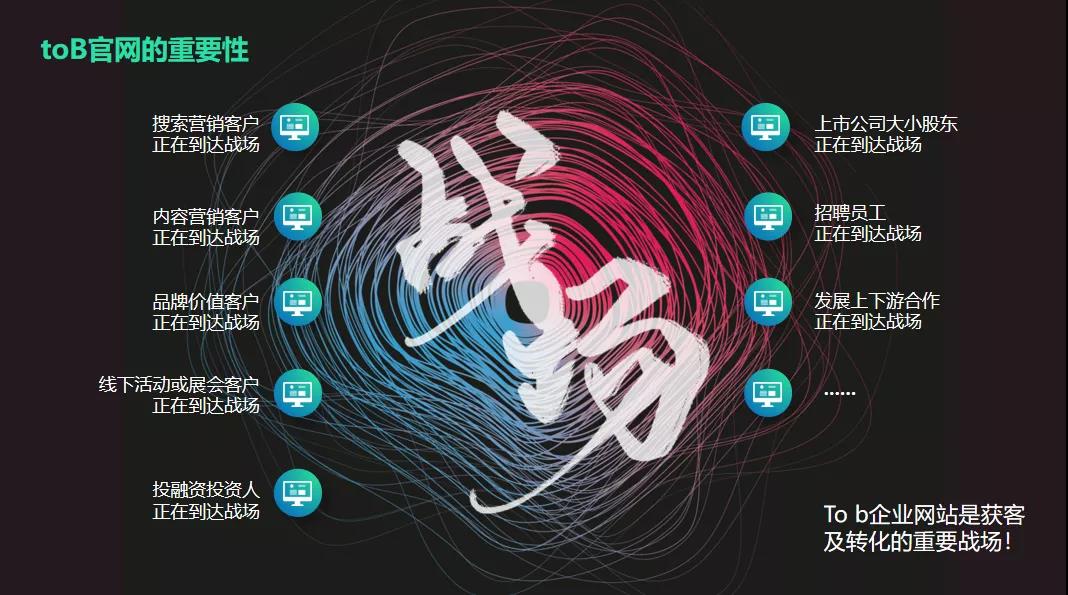 通过这张图,我把官网比作一个战场,让大家更能体会紧迫感。你会发现搜索营销的客户,通过百度投放广告,SEO而吸引来的用户,还有内容营销吸引来的用户,不管是从知乎还是在哪里看到文章点过来的用户,通过搜索品牌来的用户,还有线下活动、展会吸引来的用户,甚至包括我们做投资的投资人,都会去看这个公司的官网。