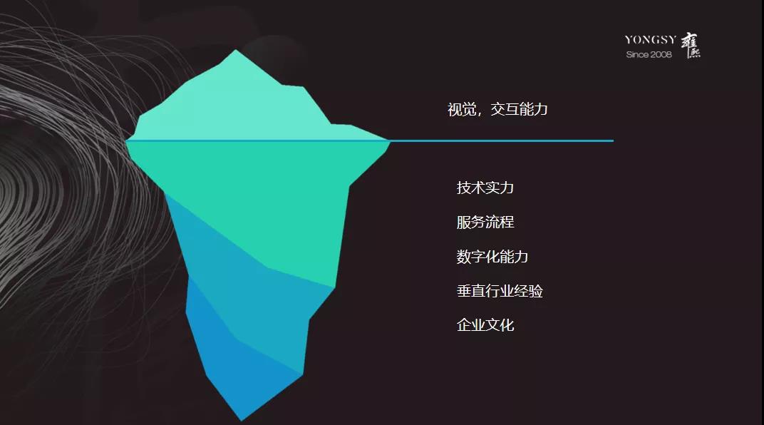 这幅图很有意思,网站建设是一个传统的业务,大家更多关注的是冰川上-视觉交互能力,其实做好一个网站,冰川下才是真正的功夫,包括技术,包括服务流程,包括数字化结合能力。