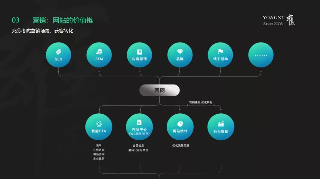 第三点,讲一下营销价值链。首先我们可以看到官网的一个位置在中间腰部,所有SEO,SEM,内容营销,品牌营销等过程的流量都会经过官网,官网之后通过布局表单在线咨询这些触点,然后包括可以规划内容中心,丰富内容中心的内容,让用户在获取内容之后之前关注公众号或者下载资料,然后增加网站获客的能力。