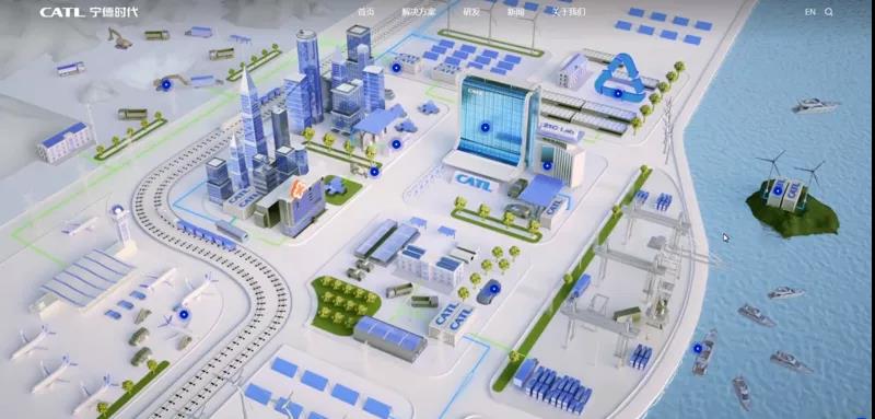 在视觉这方面,我们为宁德时代做项目的时候,采取了3D建模,加上鼠标的交互,让用户可以非常直观地了解到宁德时代全场景的解决方案。电池的应用,从储能包括海陆,包括工业的建筑,包括楼宇等等,通过3D动态的交互,清晰的展示出来。这个网站做完之后,在行业里很多人都在看这个网站,口口相传。