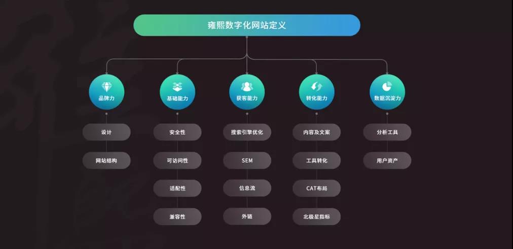 我们尝试着定义了一个数字化网站的概念,通过5个能力,第一就是品牌力,第二是基础能力,第三是获客能力,第四是转化能力,最后是一个数据沉淀能力。