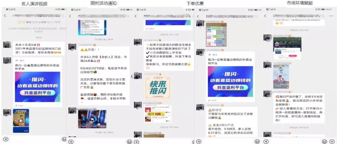 以开播通知、优惠活动、市场环境赋能、名人背书赋能等方式为主,引导群成员参与注册、裂变、下单。