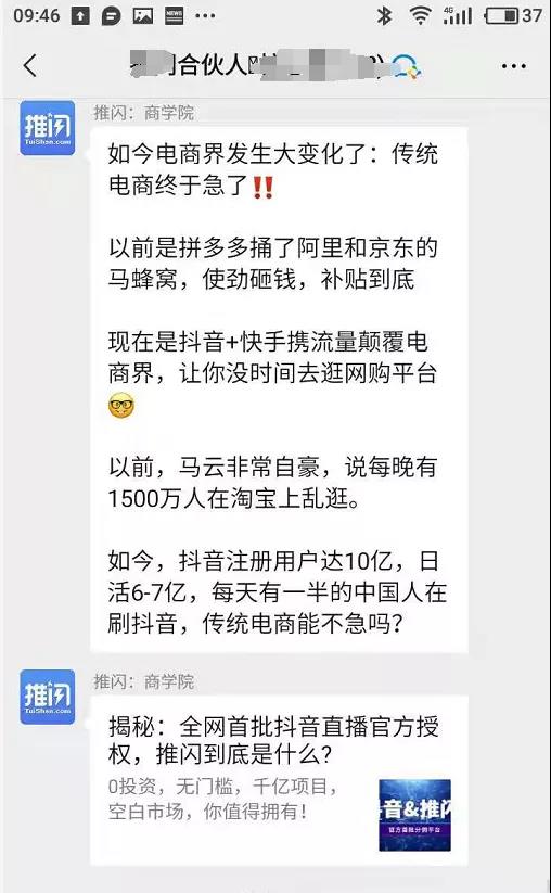 共4个环节:介绍产品和背书、介绍市场潜力、介绍推闪的使用方法、抛出利益诱饵(分别对商家、买家、推广者)、解答疑问(由于是语音讲课,展示不了截图)。