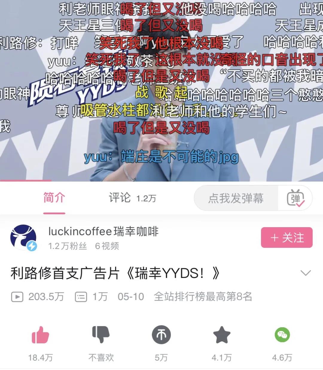 巧妙的将网络上的热门流行梗融入到内容中,增加了内容的互动性、可看性与新颖度,也让瑞幸的这支广告获得了意想不到的收获,仅仅在B站上的播放量就超过了200万,点赞18万+,转发与收藏均超过了4万,而这融梗的案例也被称之为是最成功的"被迫营业"典范。