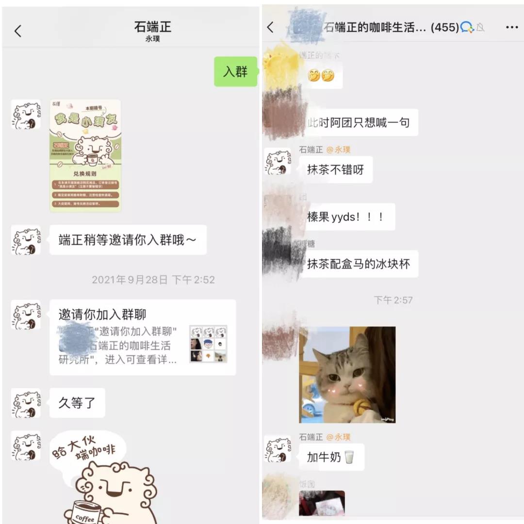 从进入社群路径开始:关注永璞公众号—— 引导添加企业微信"石端正"——成功添加企业微信 —— 回复"入群"——进入企业微信群"石端正的咖啡生活研究所"。