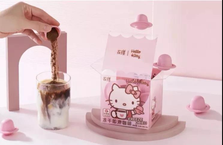 永璞最有趣的一次联名是和HelloKitty,2020年底,品牌开始尝试找一些大 IP 打造联名产品时,阿里妈妈的小二建议他们用数字技术进行人群测试(不是广告),结果发现永璞和 Hello Kitty 人群匹配度、未来的获客人群匹配度非常高,果然,上线之后瞬间就卖掉了一万盒。