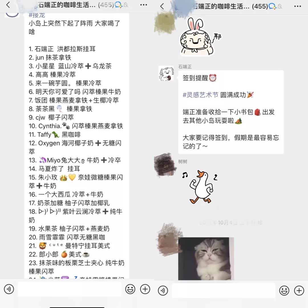 1、石端正发起群接龙,用户分享当日饮品饮品,相当于侧面种草;