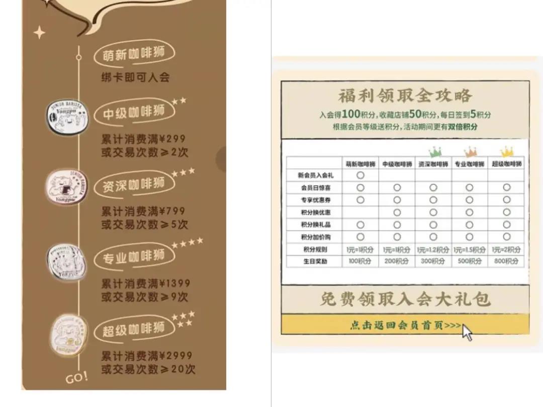 如下图,中层咖啡师的会员在店内消费200元,得到200积分;而超级咖啡师的会员消费200元,则会得到400积分。
