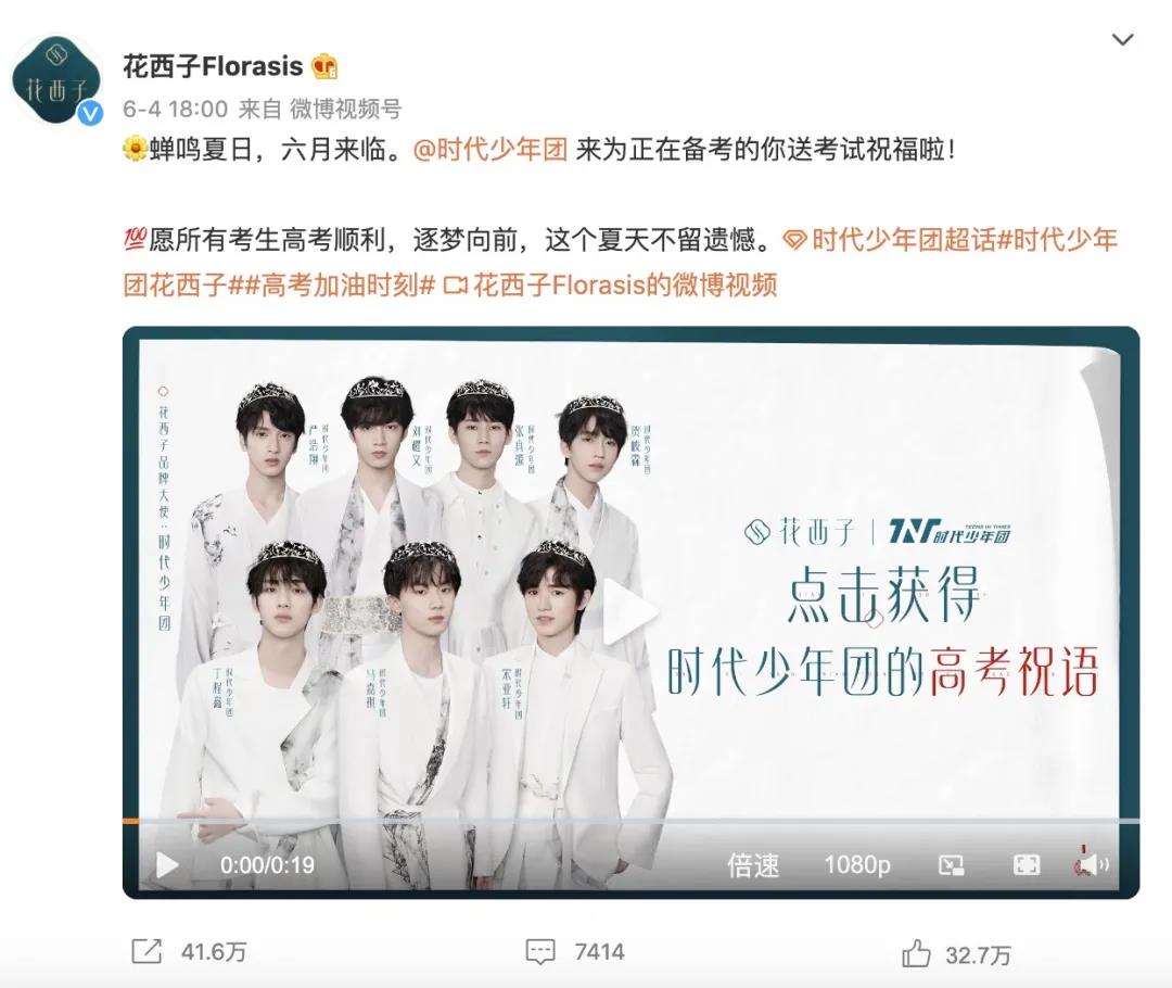 比如在微博上,花西子在高考前邀请时代少年团为考生送祝福,显然这样的内容不是针对所有人的,而只是针对喜欢这些男团的消费者的内容,这在以前会被称为亚文化,而今亚文化已不再是一个没人注意的圈层。下面这条内容的转发量还是让我感到非常吃惊。