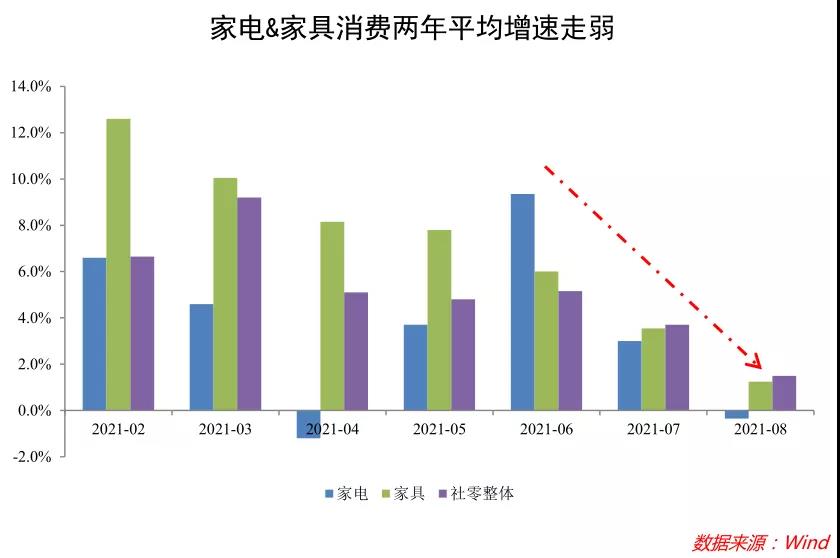 数据可以说明问题。来自国家统计局的数据显示,今年年初至今,我国住宅销售面积和住宅新开工面积的增速均处于下滑区间,尚未出现扭转迹象,并且全国30大中城市商品房成交面积已是连续数月同比负增长;与此同时,地产后周期的消费品类增速也在放缓,其中的代表便是家电和家具,最近两个月的两年平均增速几乎都表现为逐月走弱,其中8月份的家电消费甚至出现了负增长。