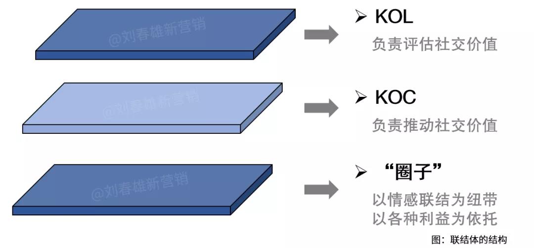 在联结体的概念中,主要有三层,顶层是负责评估社交价值的KOL;中间层是负责推动社交价值的KOC;第三层就是情感联结为纽带,以各种利益为依托的各种"圈子"。