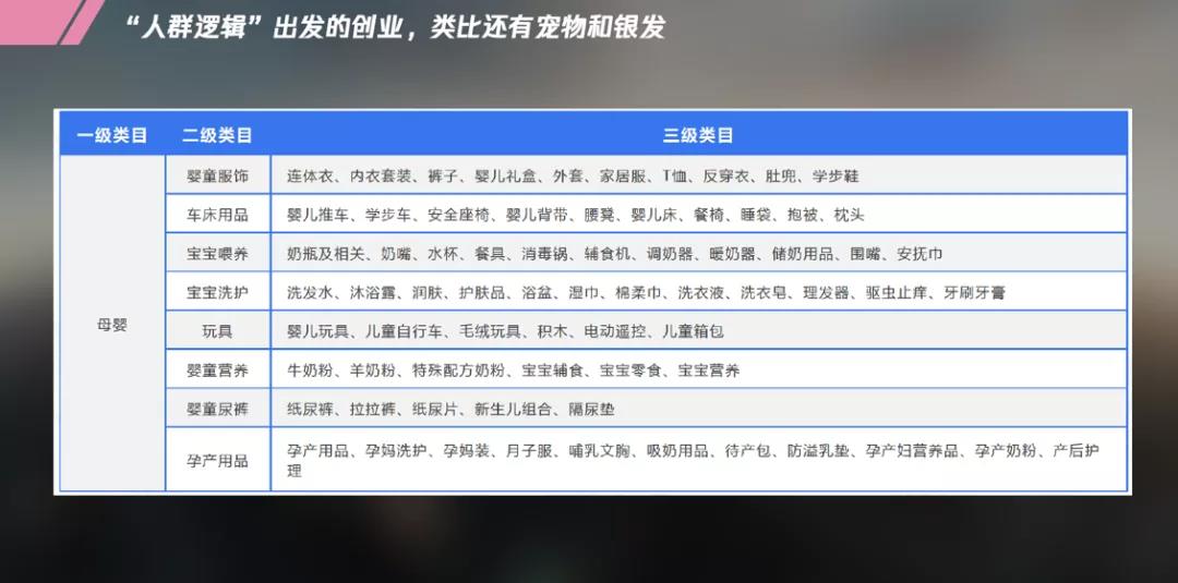 所以,虽然人群是母婴,但它所覆盖到的二级类目有服饰、车床、宝宝喂养、食品、洗护、玩具、营养、孕产用品,以及尿裤等多种孕童用品。当这些细分品类都聚在一起,这个产业其实是非常庞大的。