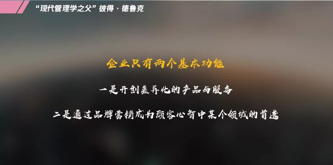 彼得·德鲁克在书中写到:企业存在的两个基本功能是:第一,开创差异化的产品和服务;第二,通过品牌营销,让品牌成为顾客心智中某个领域的首选。
