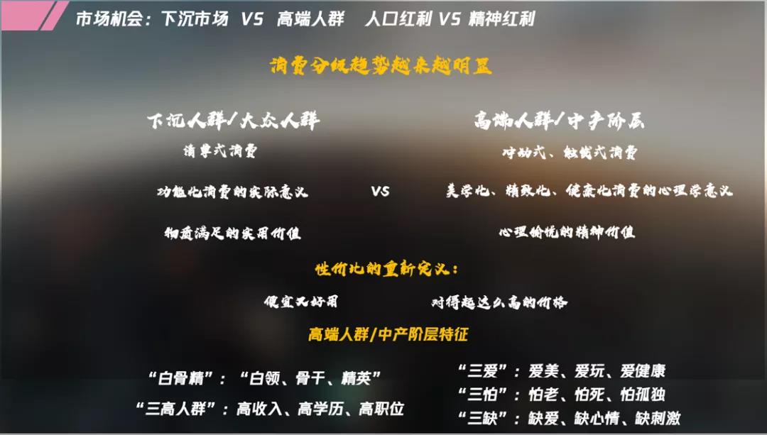 所以,高端消费人群和下沉市场人群成为我们接下来要抓的核心。但这两个人群的底层消费意识、消费习惯都有着非常明显的区别。
