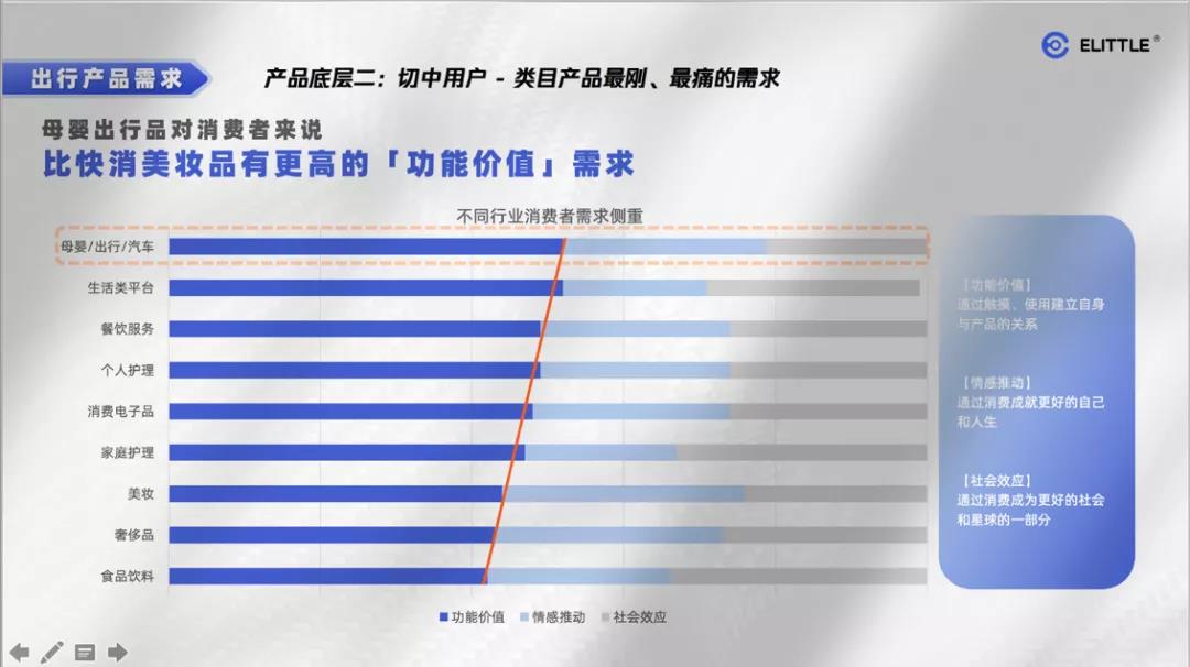 比如我们买汽车、买推车,以及打车等等,这些强调的都是功能价值。功能价值在母婴、出行和汽车里的占比是56%,其他大部分行业的功能价值占比都在50%以下。