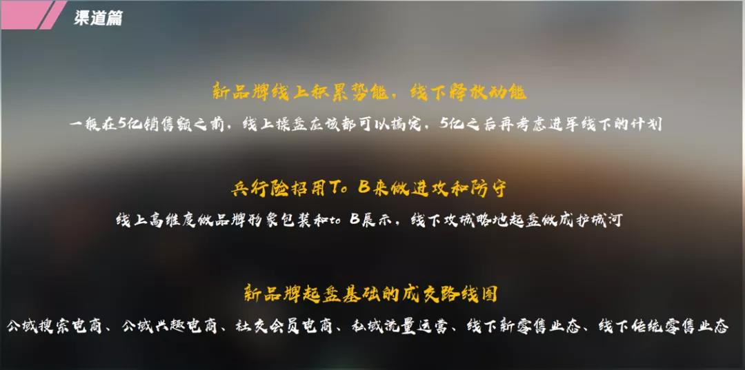 最后,再总结一下新品牌起盘在渠道拓展层面的成交路线图,大概举了六个点,基本是按时间顺序来排的。
