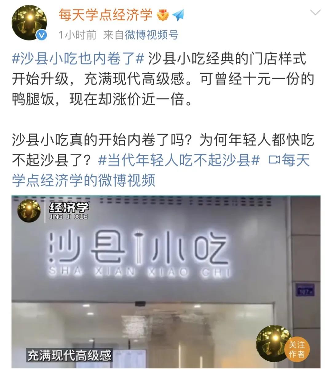 最近,微博账号@刚刚火了在微博发布消息表示,#沙县小吃也内卷了#,这该死的高级感,一下子变成了我吃不起的样子。随后,引发了网友的讨论。不少网友也晒出了自己身边的沙县小吃,而参与到话题中来。而话题#沙县小吃也内卷了#的阅读也迅速登上了热搜,实现了超1.4亿的阅读与10000+讨论。