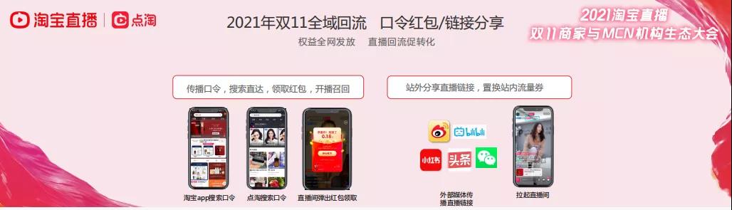 基于行内新增的第一级入职联动的新类型、直播的看点的全网分发,再加上淘宝的口令红包跟链接分享的站外回流,提升平台全域回流的能力。通过这样的流量辅证跟组合帮助商家在今年的双11用户规模得到增长。