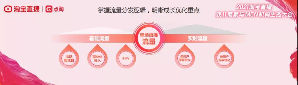 优化流量分发逻辑,明晰成长优化重点。粉丝活跃度、商业化投入、GMV作为基础流量,给予商家方法论的沉淀,保障基础流量。同时提升单用户停留时长、单用户购买转化等实时流量的转化。