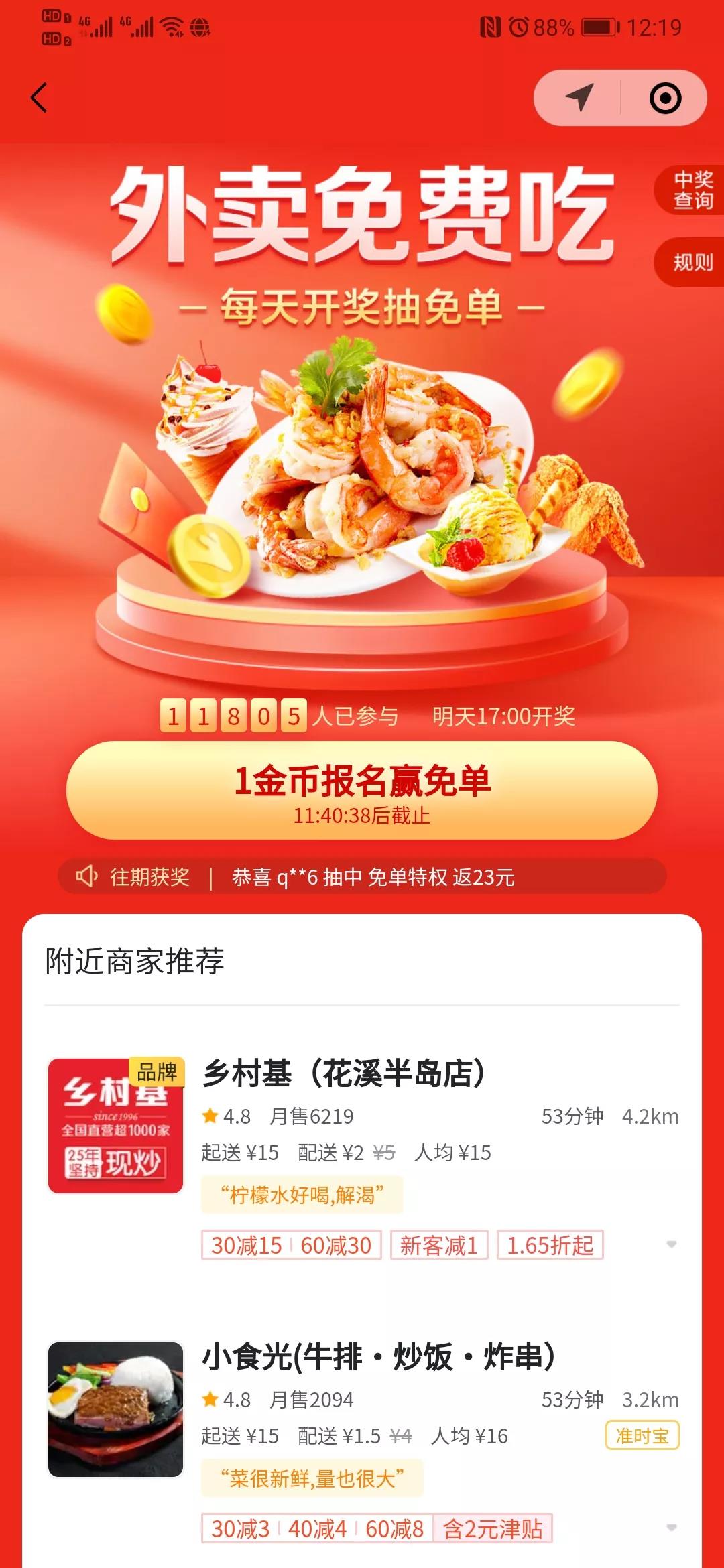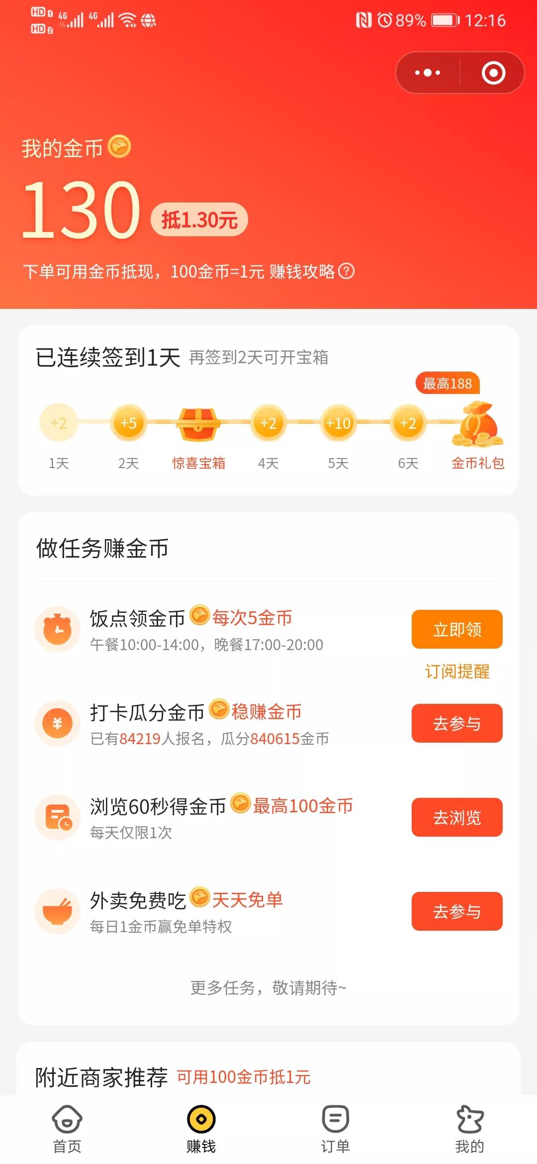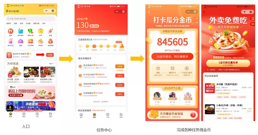 参与打卡瓜分金币的人每天有10万左右,参与外卖免费吃的每天有2-3w人,预计参与活动的用户数每天达百万级,算是一个常规性且比较有明显效果的活动