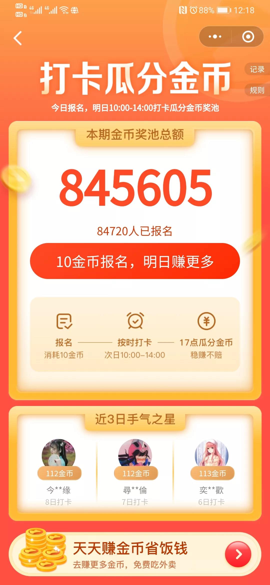 花费10个金币报名,第二天按时打卡就能瓜分金币,并且保证稳赚不赔。