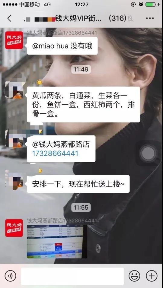 客服每天把当天的菜品和优惠折扣发到群里,用户想要买什么菜,可以让店员拍照,然后确认随时在群里下单,满38元还包配送,且是半小时送上门。
